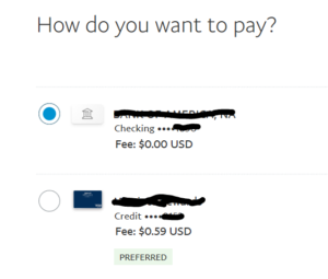 STEP 5: Choose how to pay based on what you have setup in your PayPal Account. No charge for checking account. A % fee will be charged to you if you use a credit card.